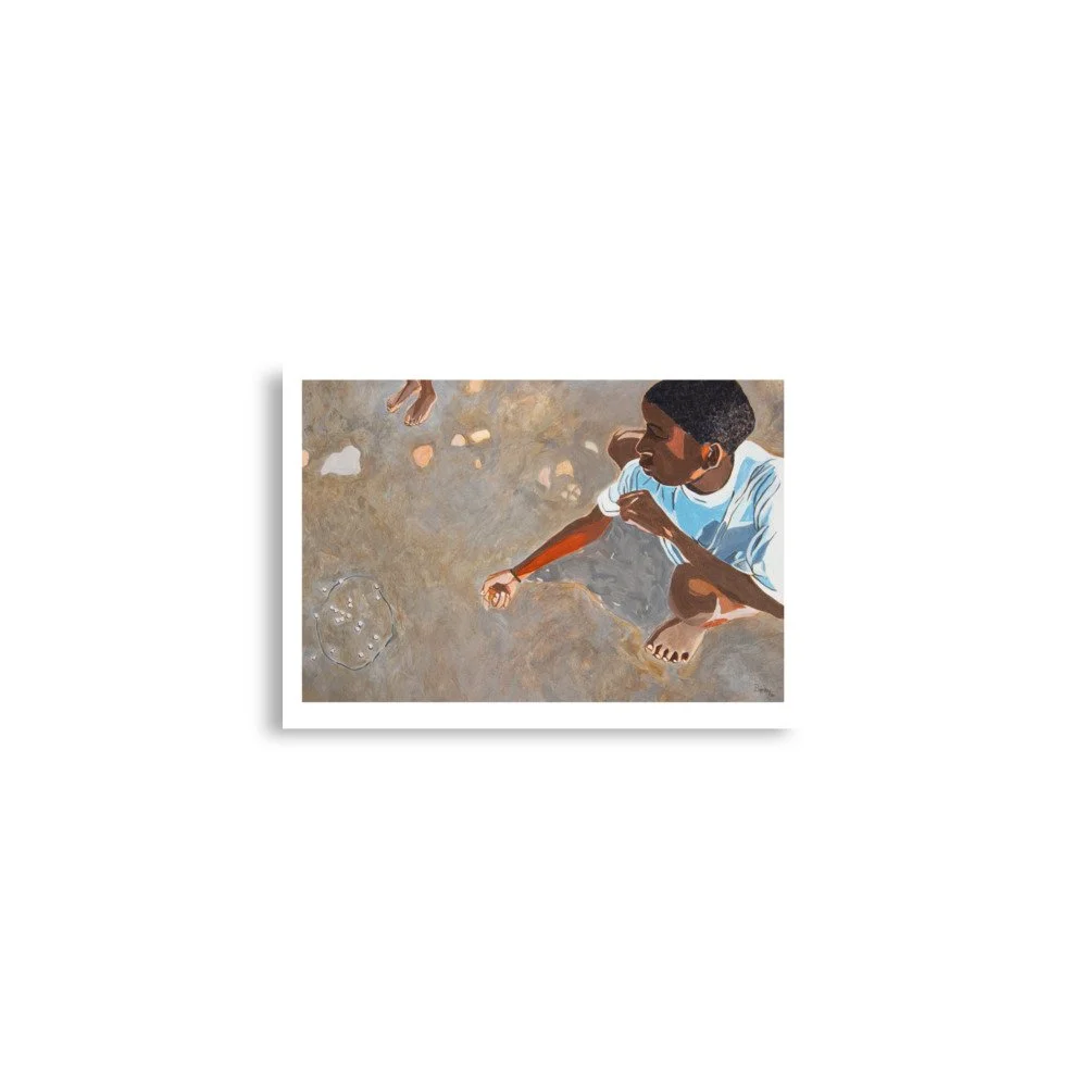 “It’s fun to play with marbles and it takes skill to do it well. In Jamaica many children like the camaraderie and the challenge it presents. This painting brings back fond memories of the many hours I spent enjoying the game in my backyard as a child.” -BINKY
